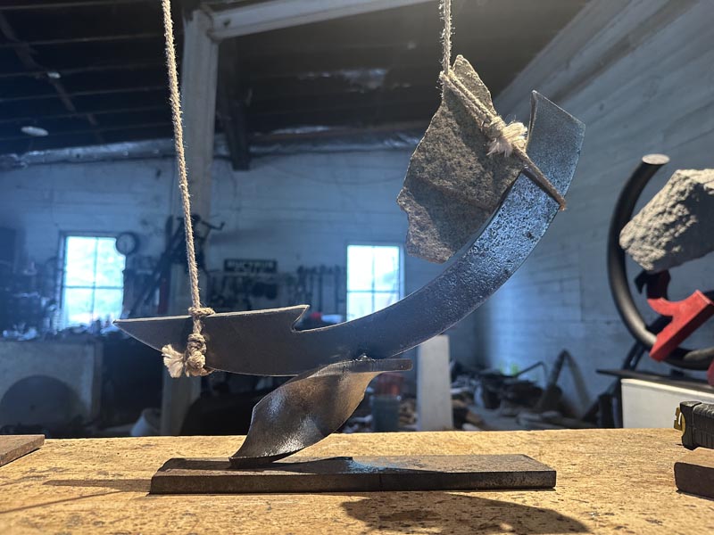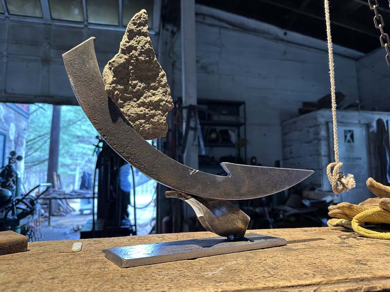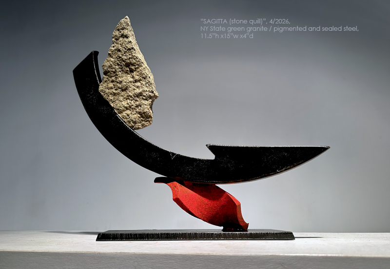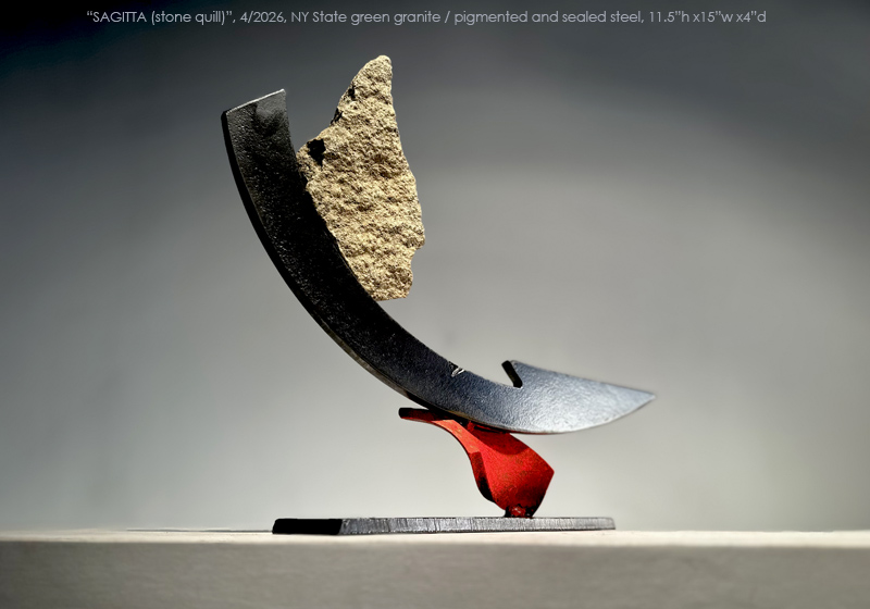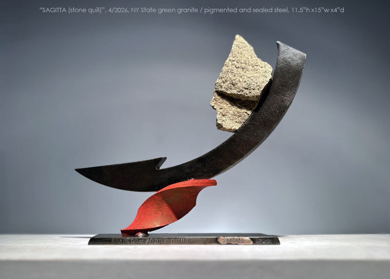 "SAGITTA (stone quill)", 4/2026, NY State green granite and pigmented and sealed steel, 11.5"h x15"w x4"d (29 x 38x 10 cm)