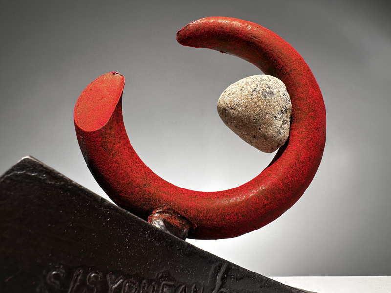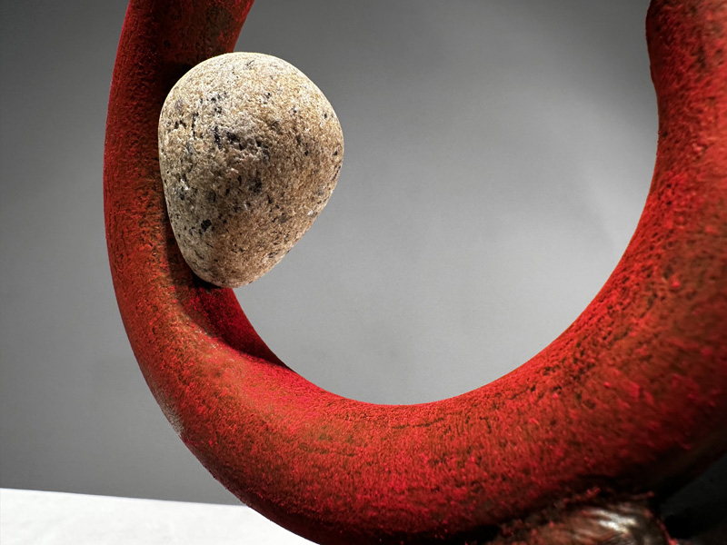 "SISYPHEAN CIRCLE 3-30-26, 3/2026, Sacandaga River stone/pigmented and sealed steel, 6"h x 8'w x 5"d (15h x 20w x 13d cm)