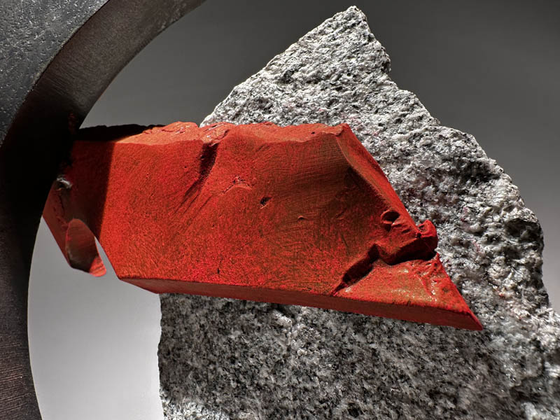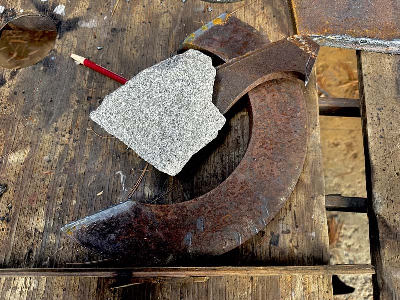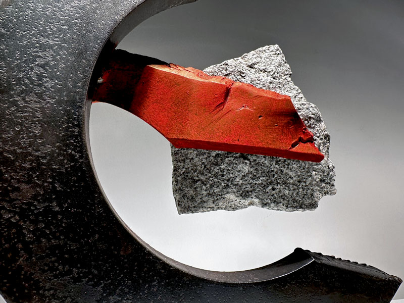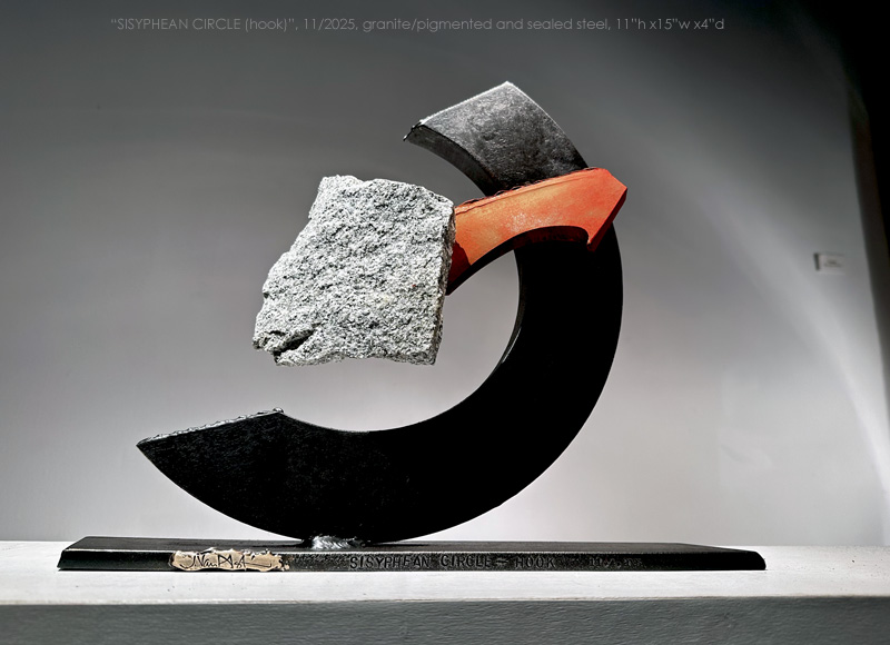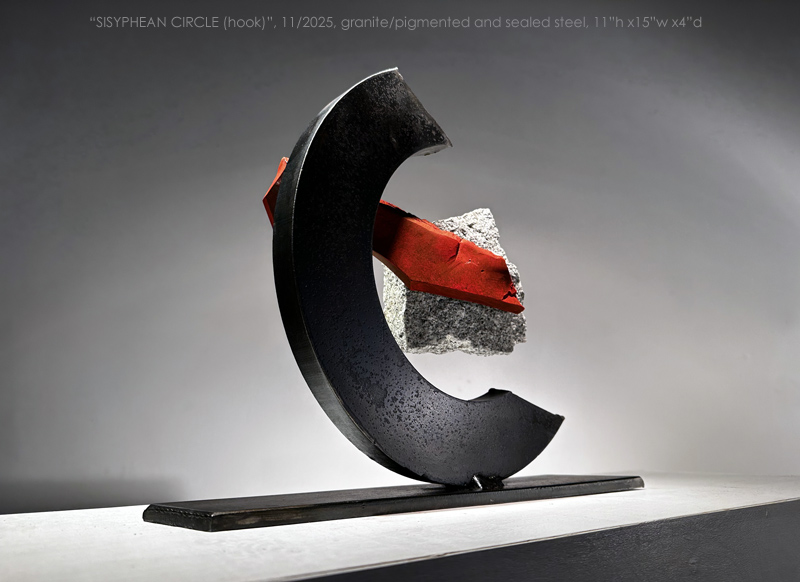"SISYPHEAN CIRCLE (hook)", 11/2025, granite and pigmented and sealed steel, 13"h x15"w x4"d (33 x 38 x 10cm)