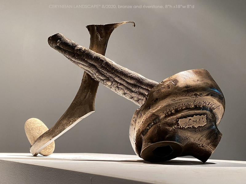"CERYNEIAN LANDSCAPE" 8/2020, bronze and riverstone, 10"h x18"w x8"d