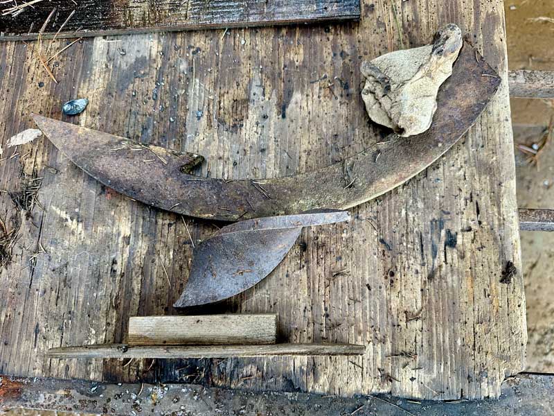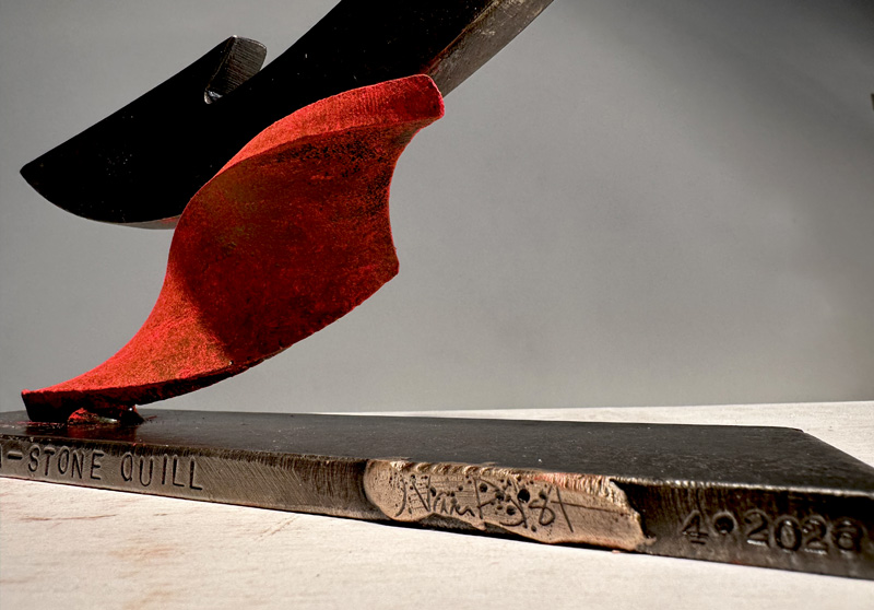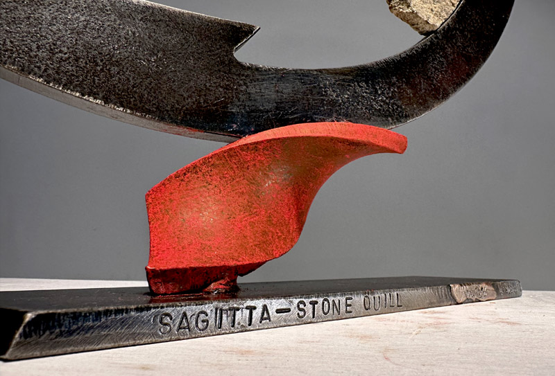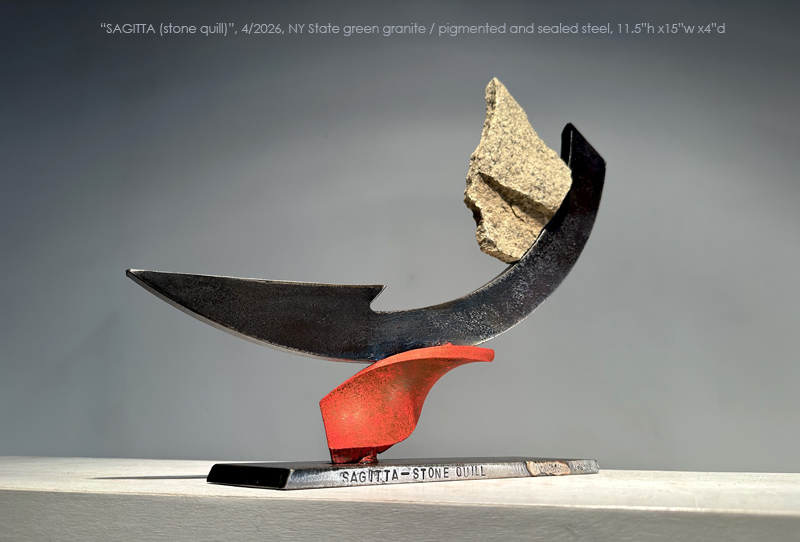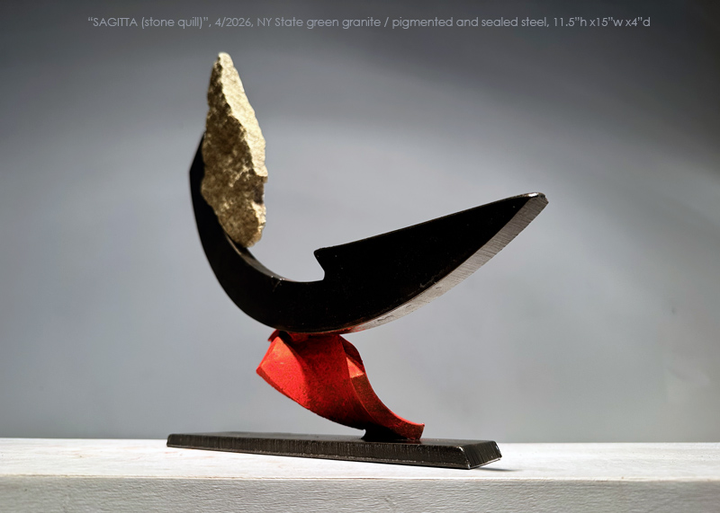 "SAGITTA (stone quill)", 4/2026, NY State green granite and pigmented and sealed steel, 11.5"h x15"w x4"d (29 x 38x 10 cm)