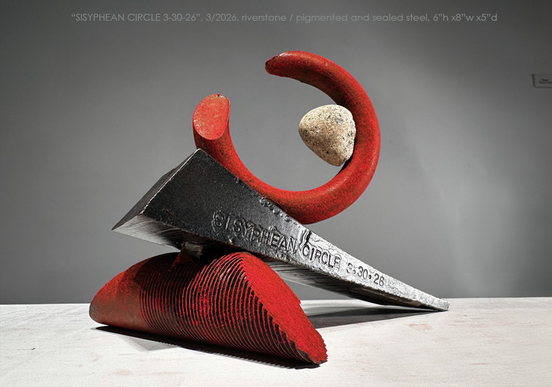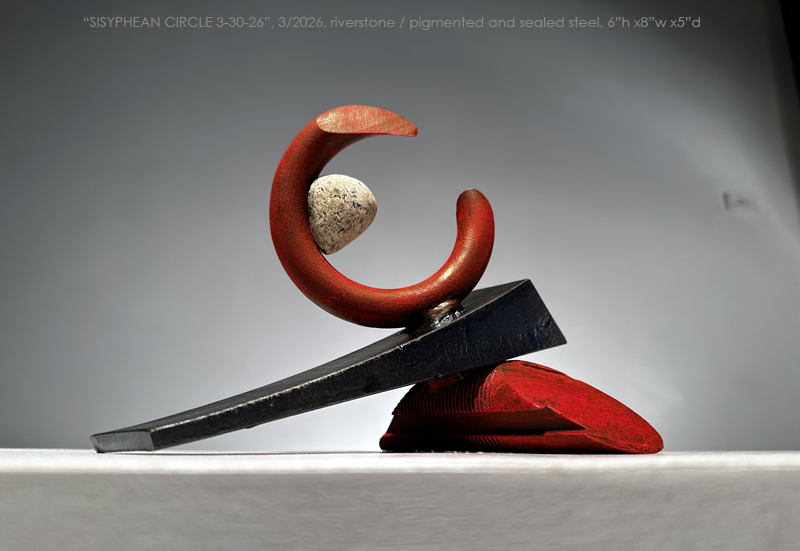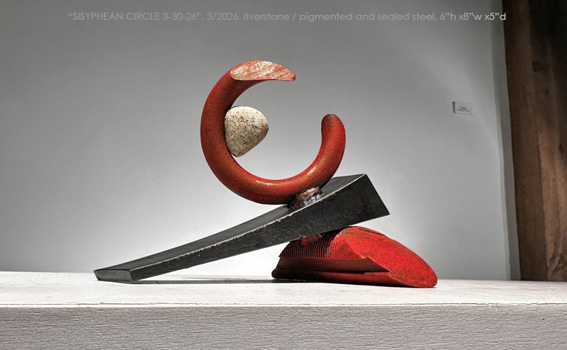 "SISYPHEAN CIRCLE 3-30-26, 3/2026, Sacandaga River stone/pigmented and sealed steel, 6"h x 8'w x 5"d (15h x 20w x 13d cm)