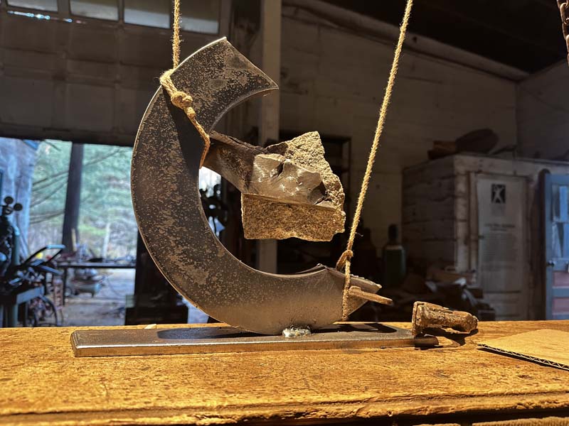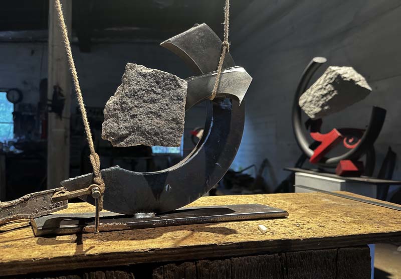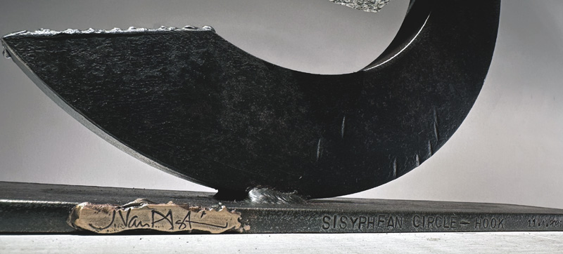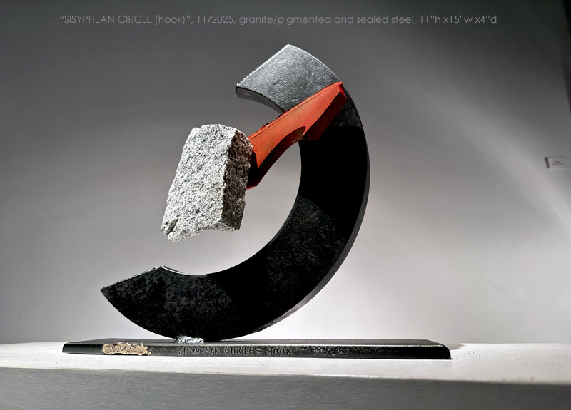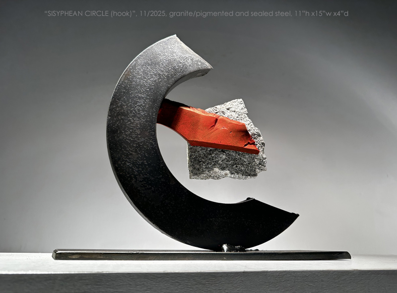 "SISYPHEAN CIRCLE (hook)", 11/2025, granite and pigmented and sealed steel, 13"h x15"w x4"d (33 x 38 x 10cm)