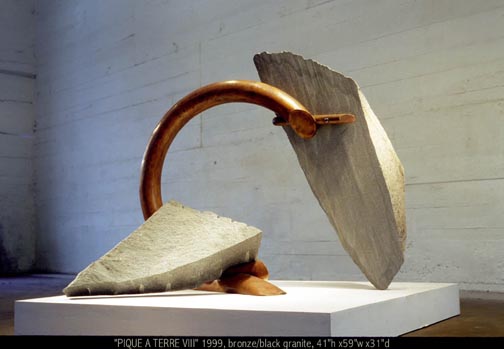 "Some more recent pieces refer to movement of the figure, particularly the Juggler and Pique à Terre series. Pique à terre is a term from classical French ballet for a pose with one toe touching the ground, the other foot firmly planted, and a sweeping arm gesture. Once you are aware of the title, when you see the piece the connection is clear. I am in a sense choreographing these works, getting a heavy weight off the ground and making it dance—taking what is often seen as a negative, the fact that stone is damn heavy and a big hassle to move around, and turning it into a positive. It is this transition that helps give theses pieces their magic"*. *from : Bones of the Earth, Spirit of the Land. The Sculpture of John Van Alstine |